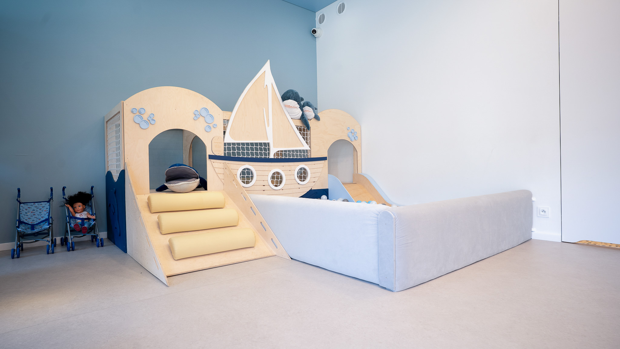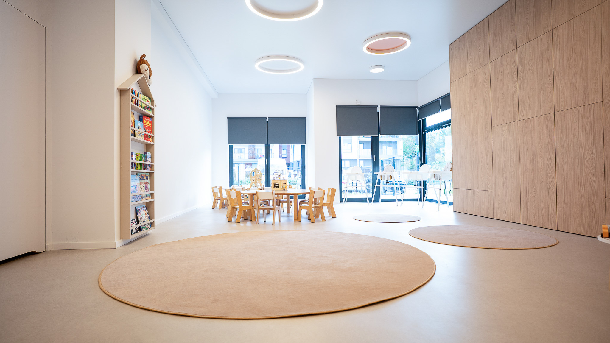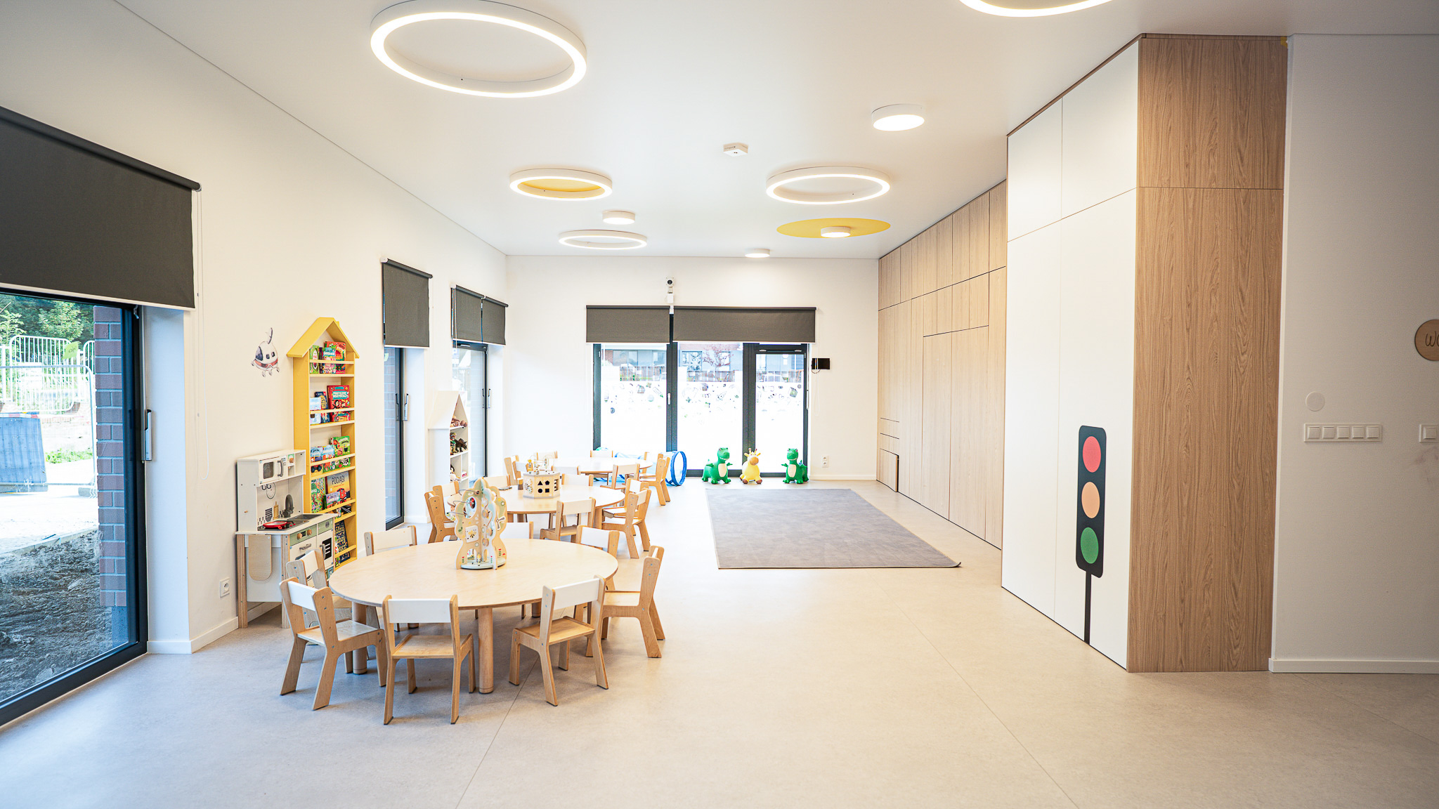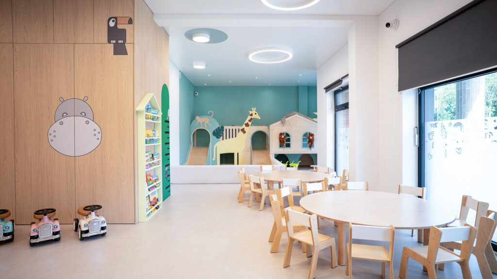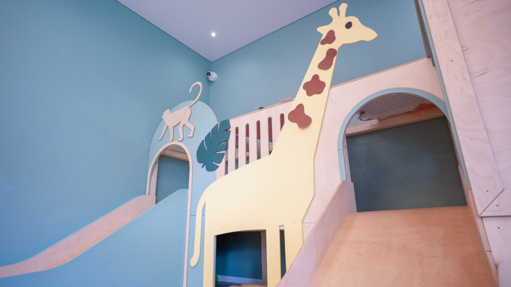 Żłobek dysponuje czterema salami, każda posiada wyjście na własny taras. Aranżacja przestrzeni umożliwia maluchom swobodny rozwój i zabawę. Sprzyjają temu przestronne, estetyczne i nowoczesne sale zajęć, o powierzchni prawie siedemdziesięciu metrów kwadratowych każda, utrzymane w pastelowych kolorach, wyposażone w nowoczesne zabawki i pomoce dydaktyczne. Przestrzeń w poszczególnych salach to niepowtarzalna sceneria, nawiązująca tematycznie do morza, lasu, dżungli i miasta, motywująca dzieci do podejmowania samodzielnego działania, odkrywania zjawisk oraz zachodzących w przyrodzie procesów. Przestronne wnętrza dają możliwość organizowania kreatywnych zajęć, w tym muzycznych, plastycznych oraz ruchowych z wykorzystaniem sprzętu sportowego.